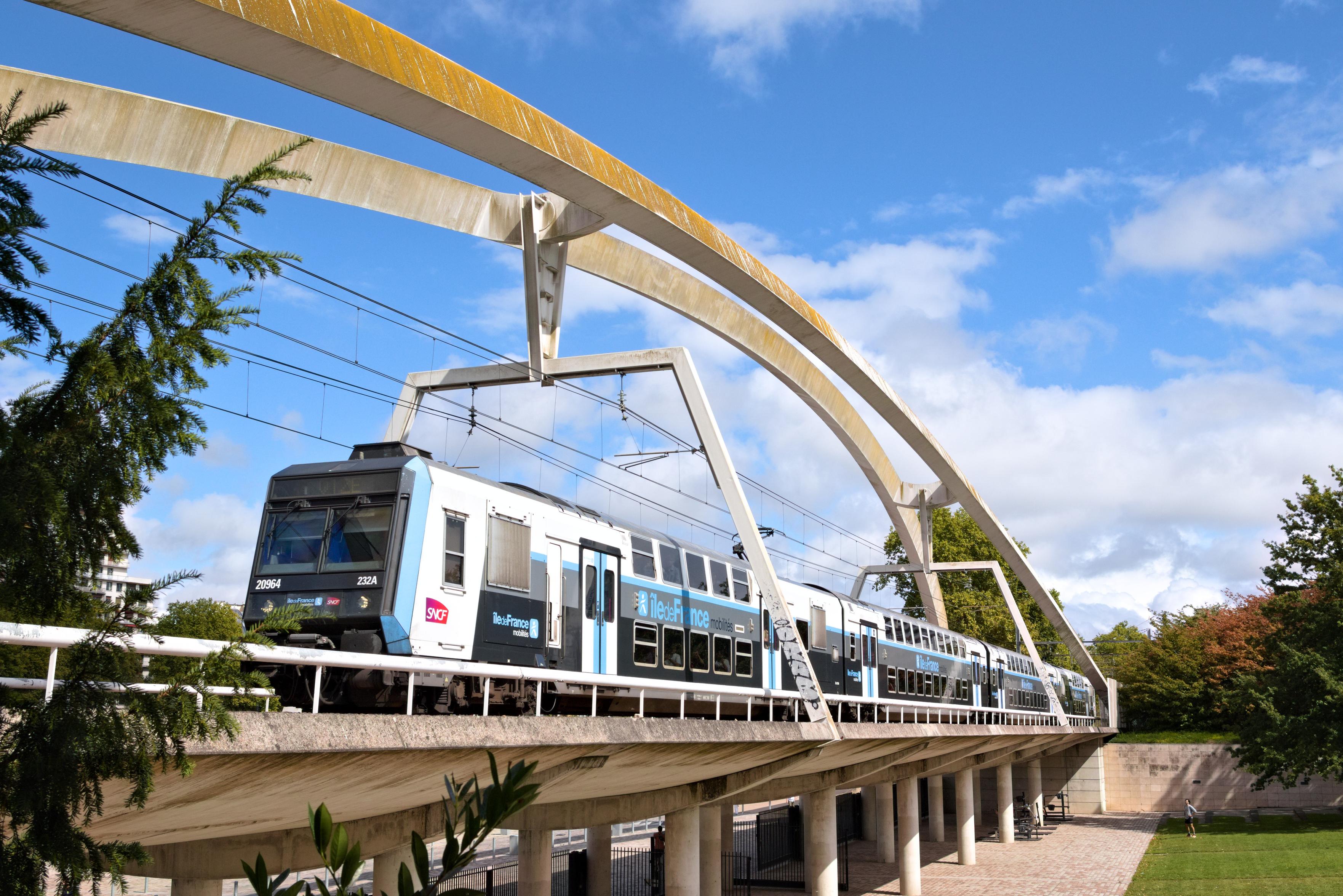 Le RER C de Paris enjambe le parc André Citroën grâce à un beau pont en béton qui, ici, voit passer une Z 20900 en livrée Île-de-France Mobilités. Il s’agit de la rame 232 A, précisément. En regardant bien, on lit le code mission VIZE sur la girouette. Elle se trouve entre les gares de Javel et Pont du Garigliano.